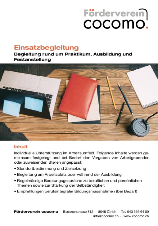 - Das Angebot jucomo wurde von der Zürcher Hochschule für angewandte Wissenschaften (ZHAW) evaluiert. Die Ergebnisse sind erfreulich: Die Teilnehmenden, die Betriebe sowie auch die zuweisenden Stellen zeigen sich ausgesprochen zufrieden. Die Studie können Sie hier herunterladen.